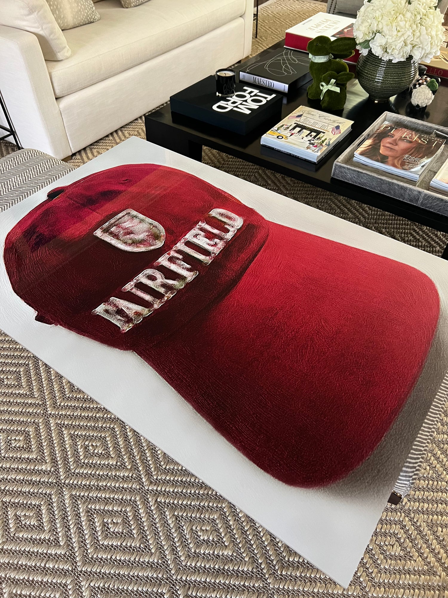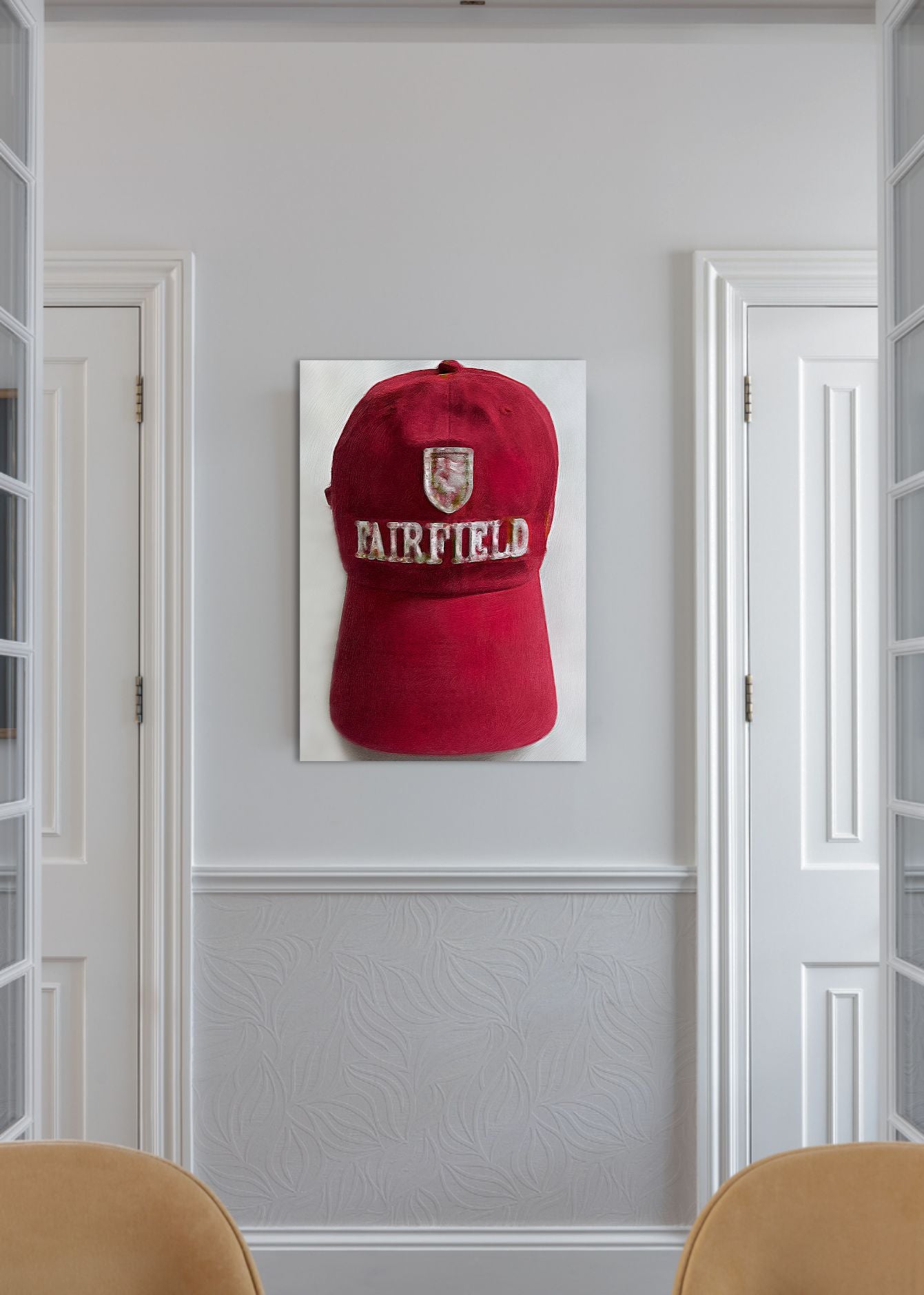 In a stunning modern women’s walk-in closet, where luxury meets personal expression, the Axis Hats artwork of Fairfield University takes center stage.